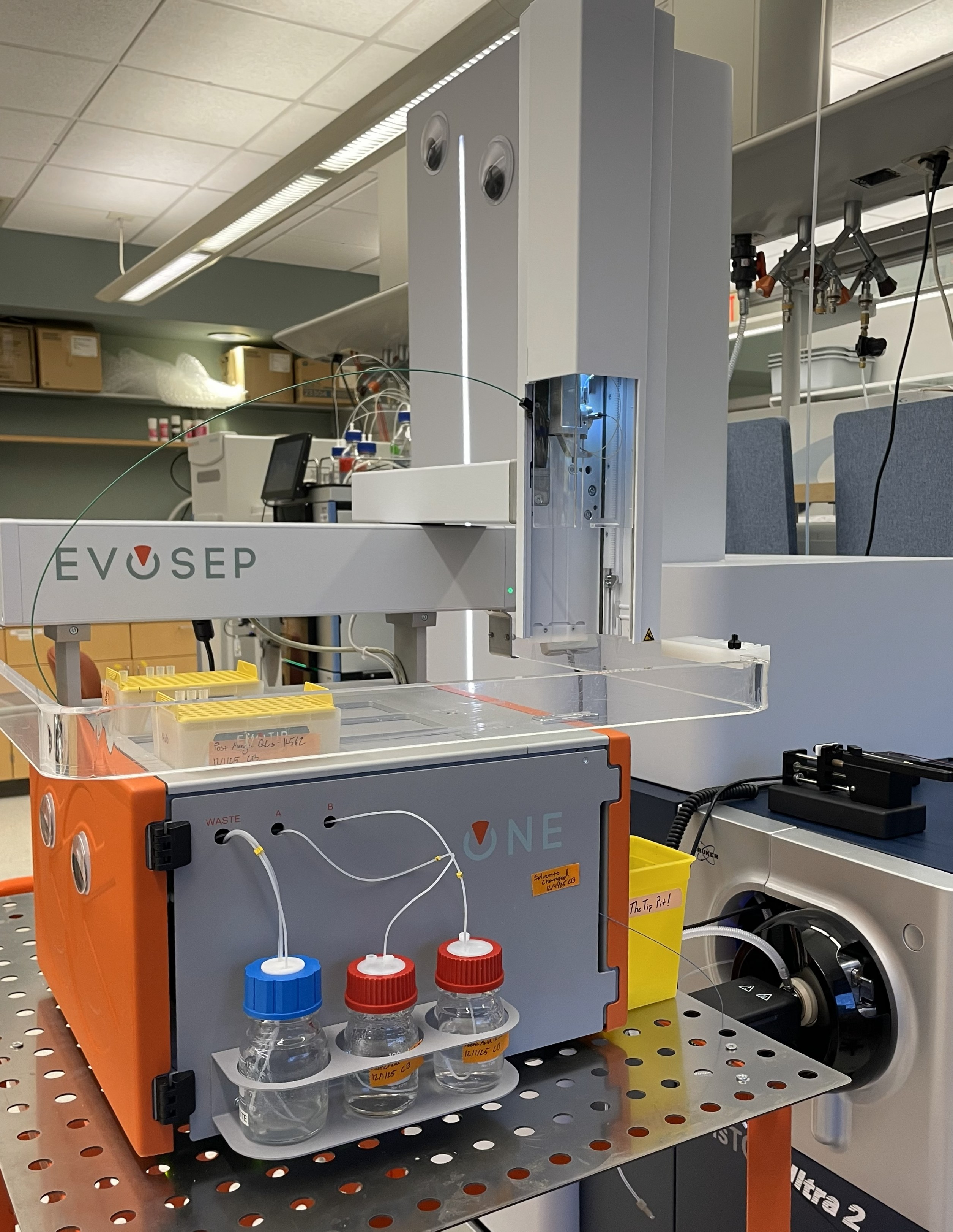 The TIMSTOF Ultra2 is a dedicated instrument for sub-nanogram and single-cell proteomics. It is coupled to an EvoSep One system for rapid semi-automated cleanup and injection of up to 80 unlabeled single cells per calendar day. When employing multiplexed reagents the system can analyze up to 700 single cells per day after suitable inter- and intra-batch quality control and assurance standards. Single-cell isolation and digestion can be performed using a Tecan Uno system for less complex mixtures of dissociated cells. Single cells can also be isolated and pre-processed using our provided protocol for delivery or shipment to the core for analysis.