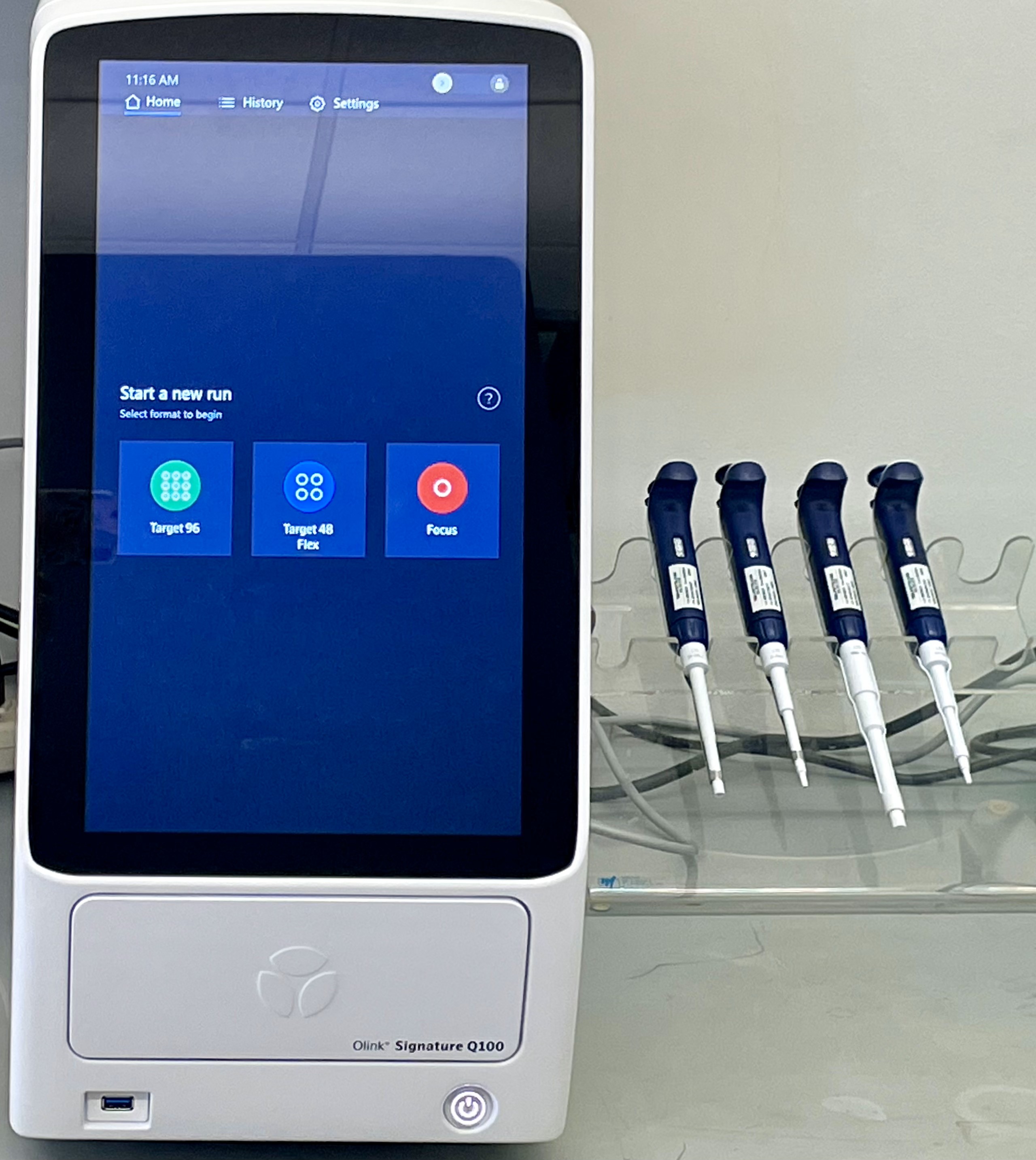 Olink® Signature Q100 is a dedicated system specifically designed for readout of Olink® Target (96 & 48-plex), Olink® Flex (15–21 chosen assays) and Olink® Focus (custom design) protein biomarker panels. Olink® Signature Q100 will measure targeted proteins either quantitatively or relatively using only 1 microliter of plasma or serum.
